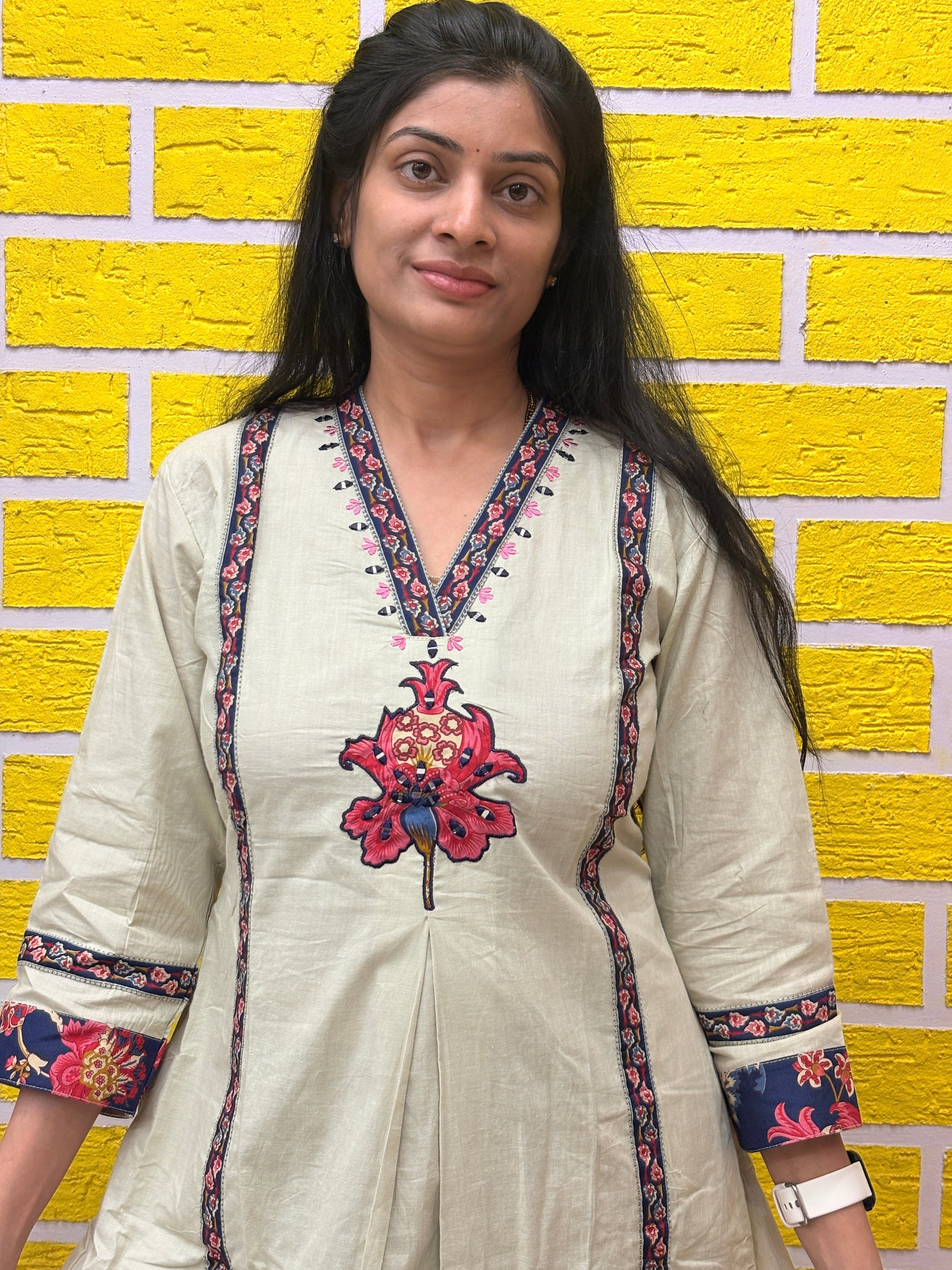 Step into effortless elegance with this beautifully designed Cream and navy cotton coord set. The kurti features a flattering V-neck highlighted with contrast printed borders and a striking floral motif at the center, adding a touch of ethnic charm. Paired with navy floral printed pants, this coord set blends classic aesthetics with everyday comfort—perfect for office wear, casual outings, or relaxed festive days.
