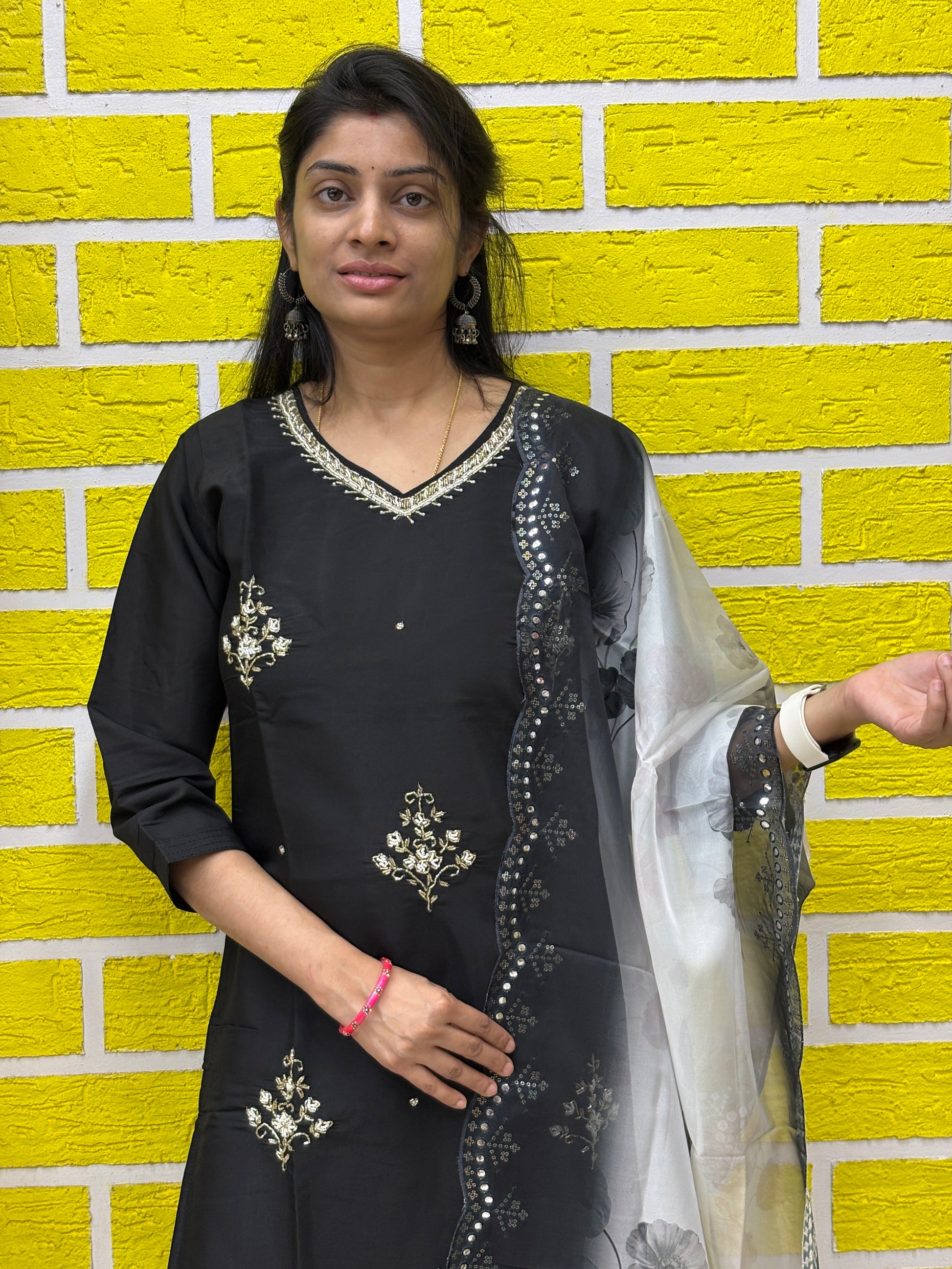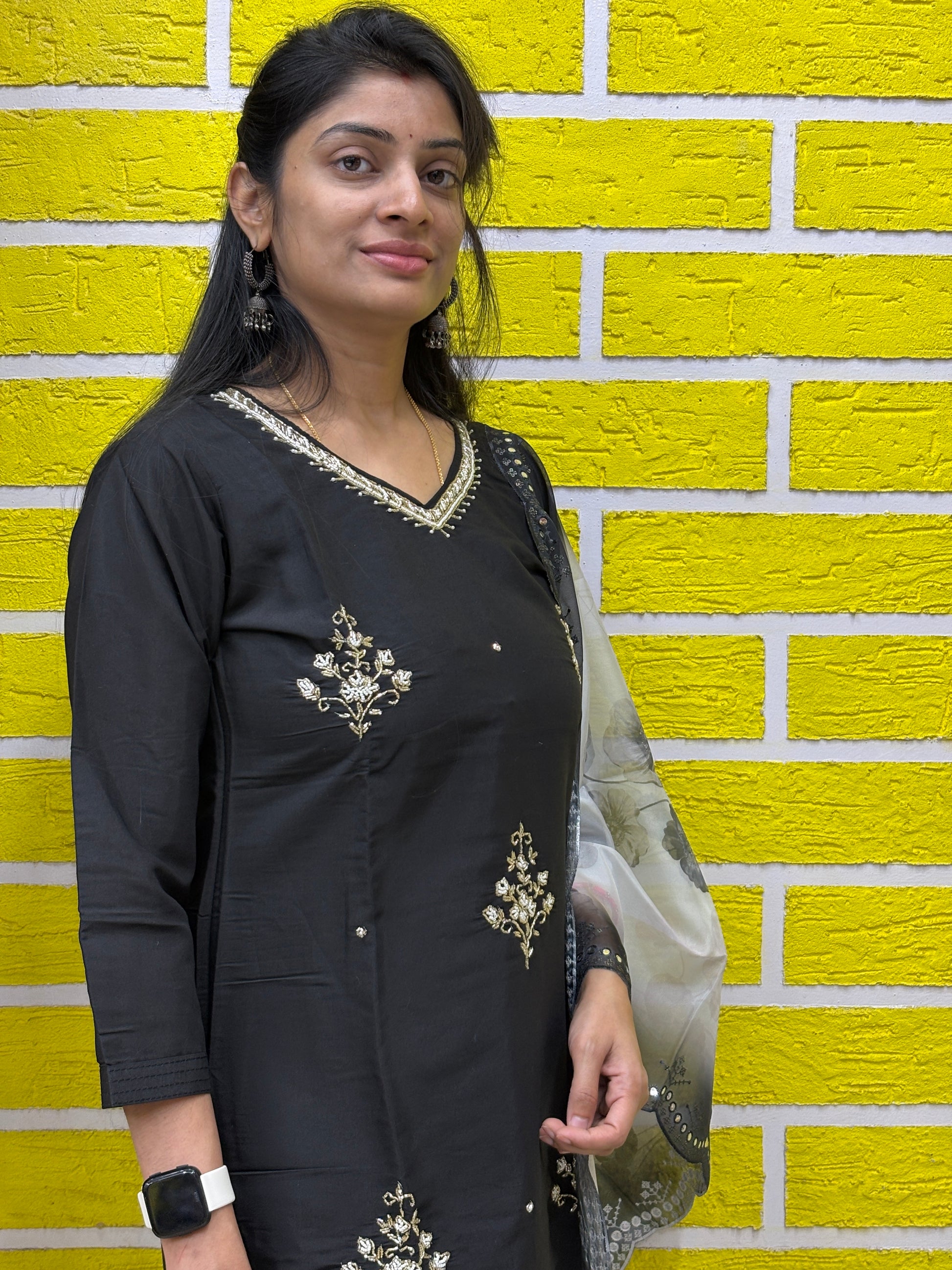 Make a timeless style statement with this elegant black kurti set, crafted to bring out understated luxury. The kurti is beautifully adorned with delicate gold embroidery motifs and a finely detailed V-neckline with mirror & thread work, giving it a rich yet graceful appeal.
