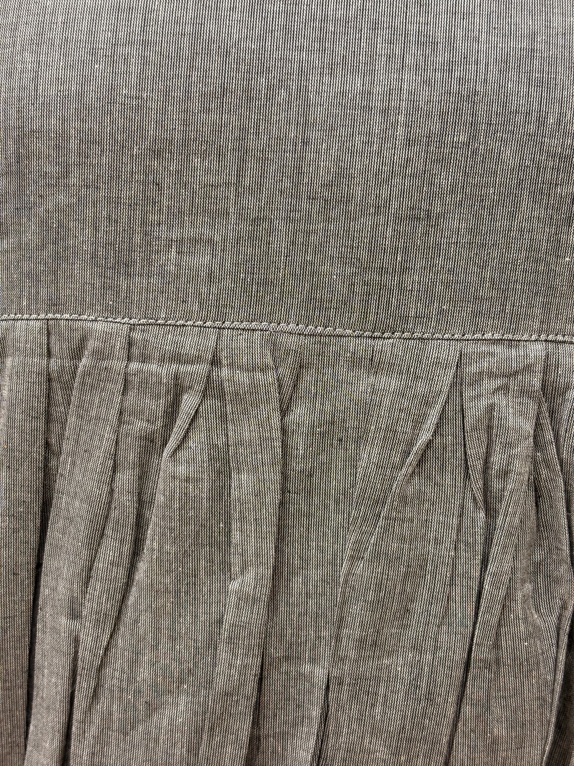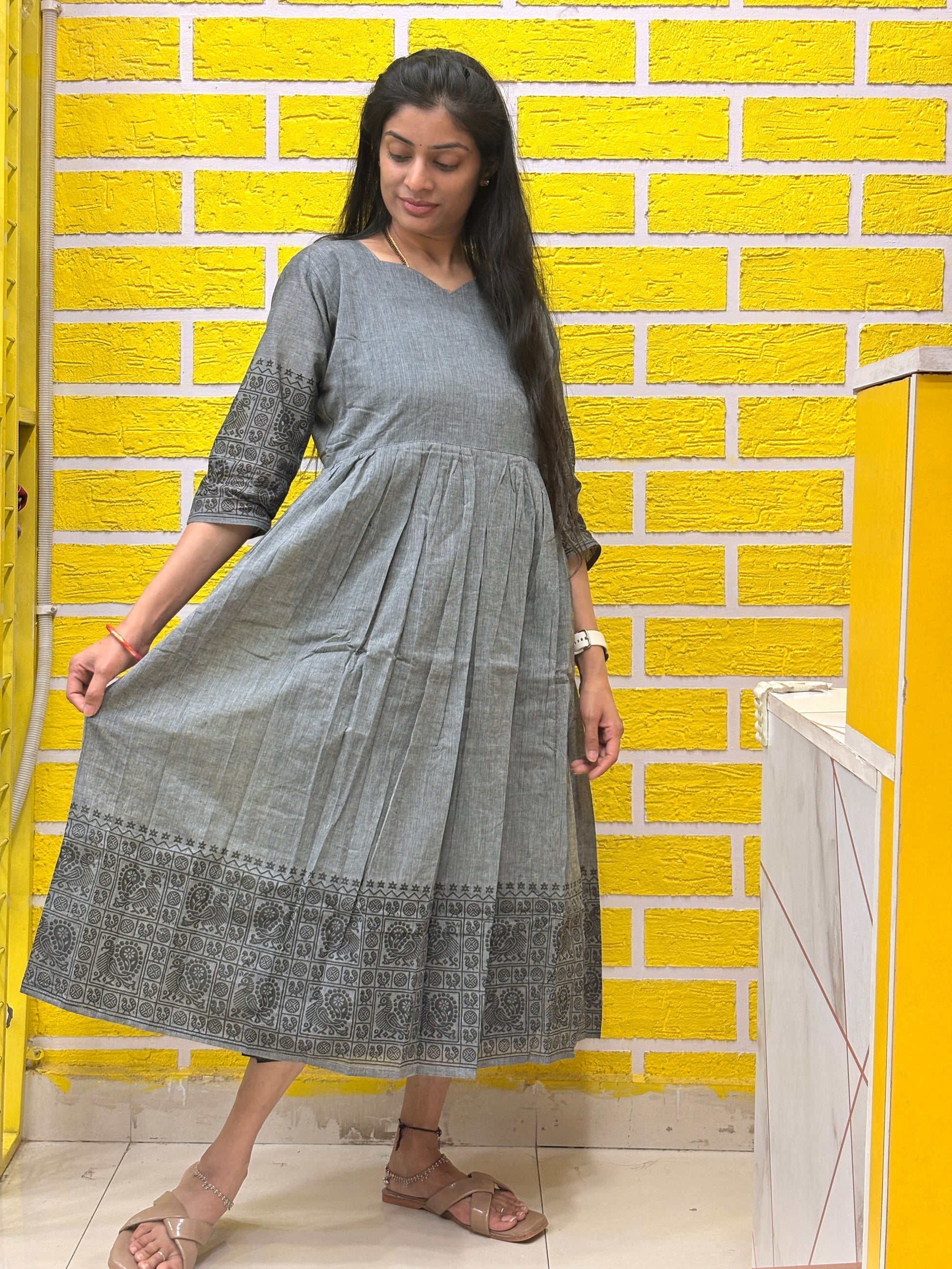 Embrace understated elegance with this classy grey cotton frock, designed for effortless everyday comfort. Featuring a subtle printed border on the sleeves and hemline, this frock comes with a softly gathered waist that creates a graceful, flowy silhouette. The minimal yet refined design makes it a versatile choice for office wear, casual outings, and relaxed daywear.