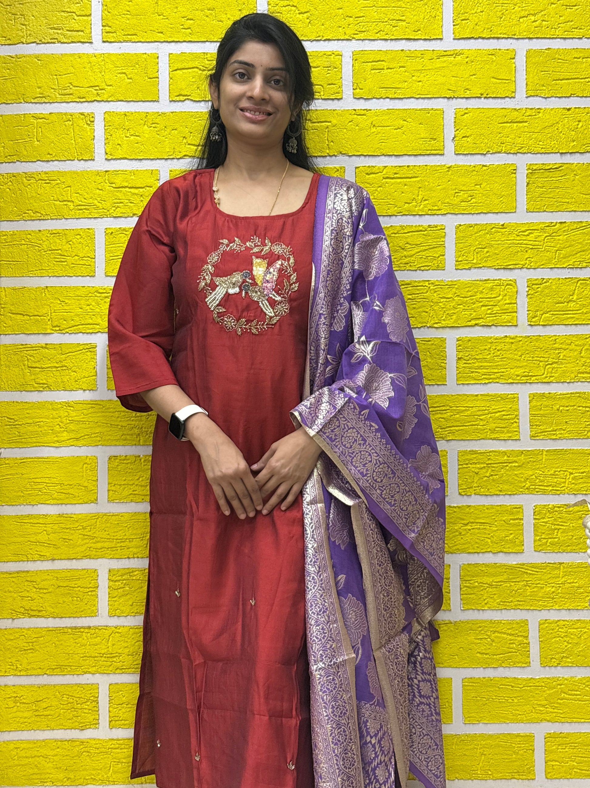 - Color: Maroon Kurti with Purple Dupatta