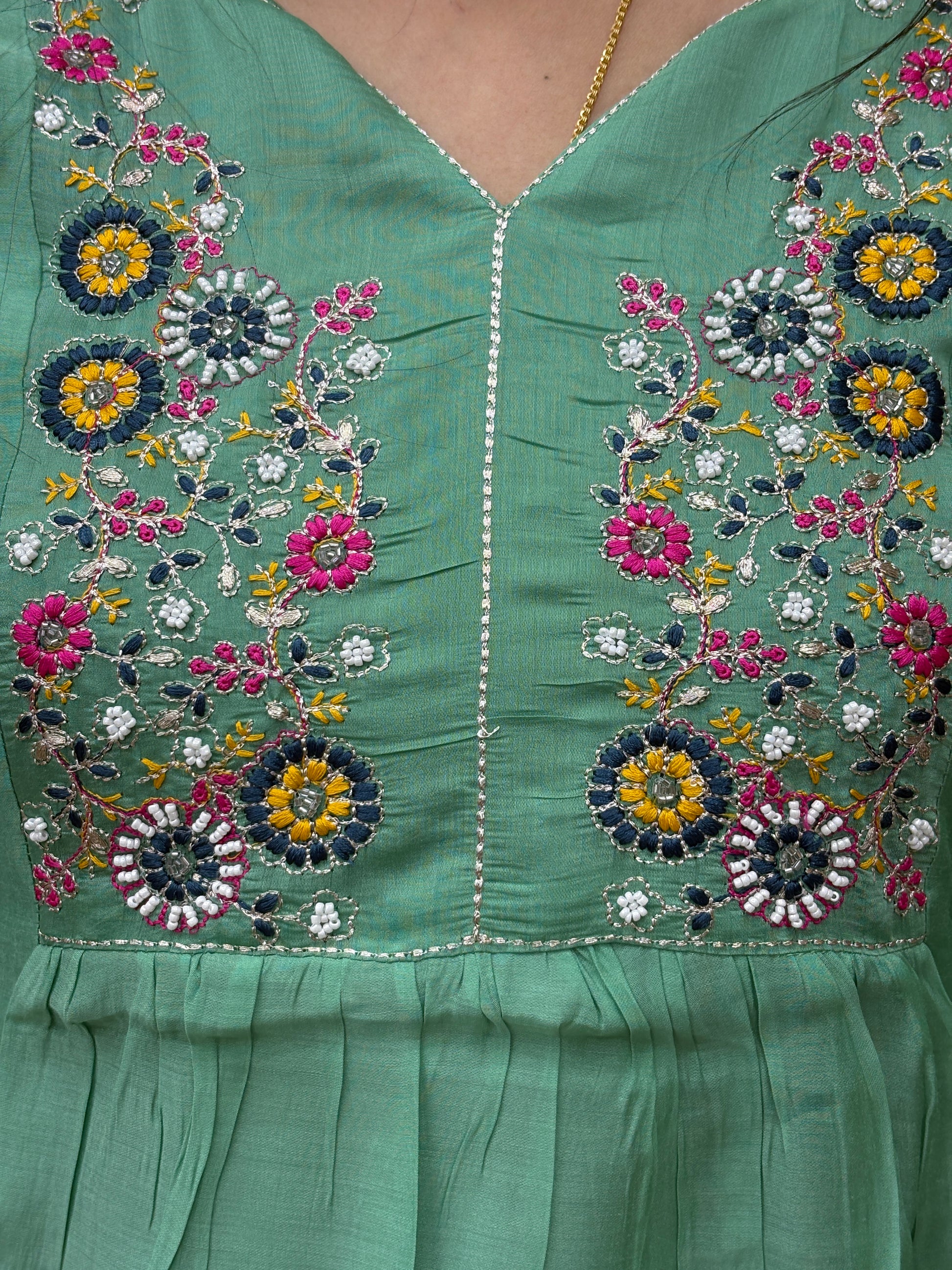 Refresh your ethnic wardrobe with this elegant mint green kurti set, designed for effortless grace and everyday comfort. Crafted from soft, breathable fabric, this ensemble features delicate floral embroidery on the yoke and sleeves, adding a subtle pop of colour and charm.