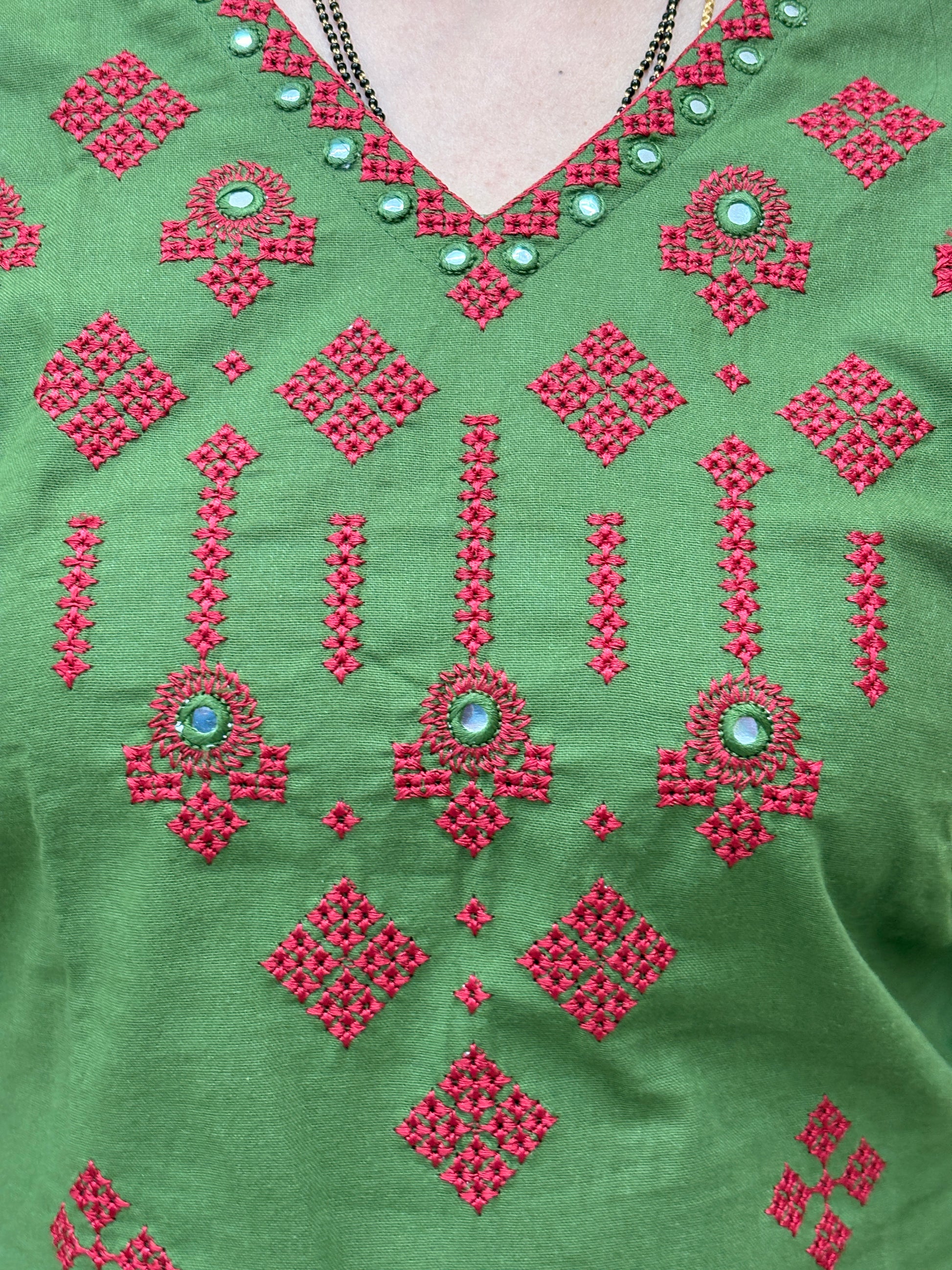 Elegant and comfortable, this olive green cotton co-ord set is perfect for effortless everyday styling. The kurti-style top features delicate embroidery motifs across the front with neatly finished neckline and sleeve borders. Paired with a matching bottom, this 2-piece set offers a clean, coordinated ethnic look ideal for office wear and casual outings.
