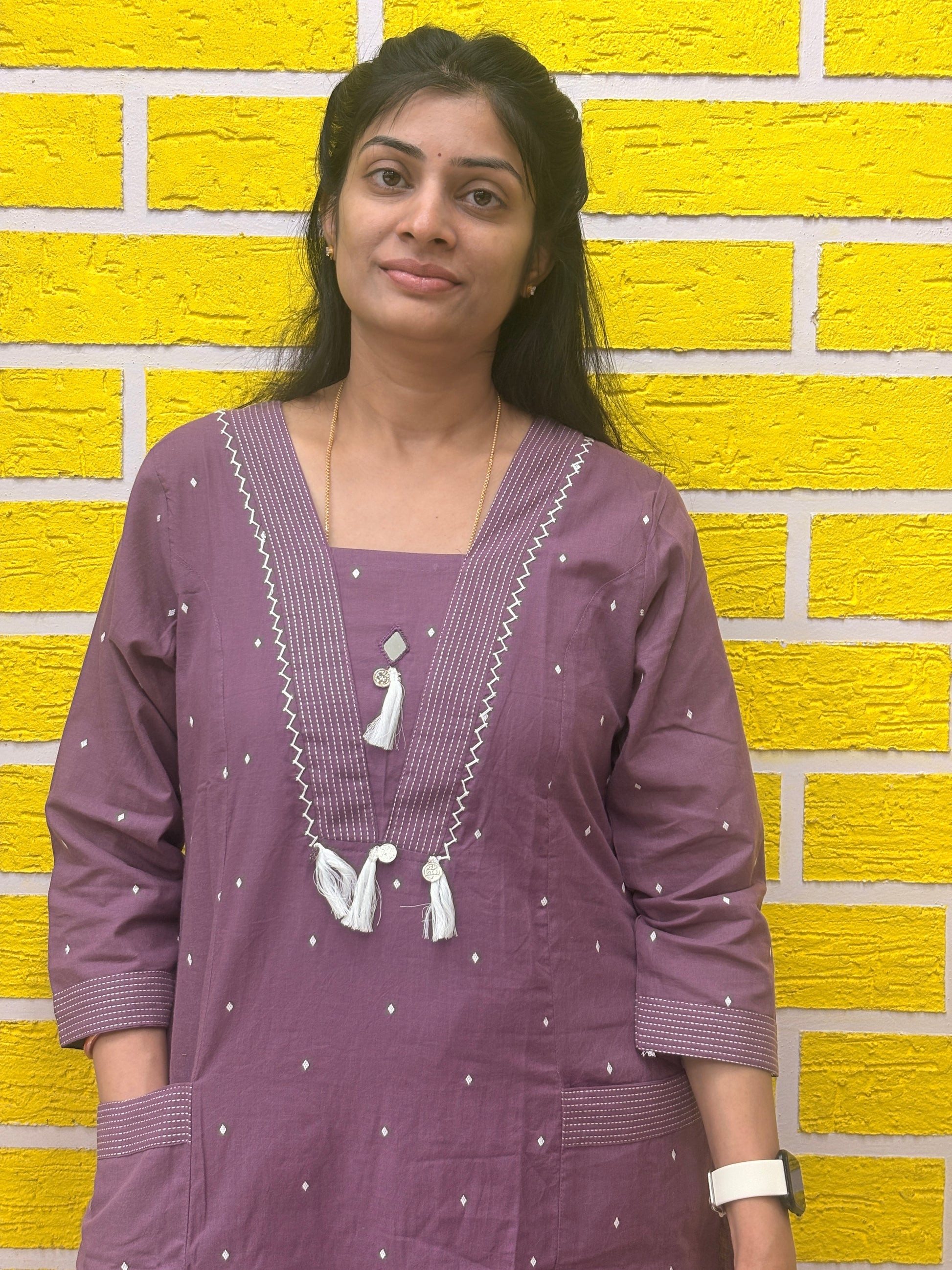 Experience all-day comfort with this pure cotton co-ord set, designed for effortless everyday elegance. Crafted in a soothing mauve shade, the kurti features delicate all-over dot motifs, a stylish V-neckline with contrast stitch detailing, and elegant tassel accents that add a subtle handcrafted charm.