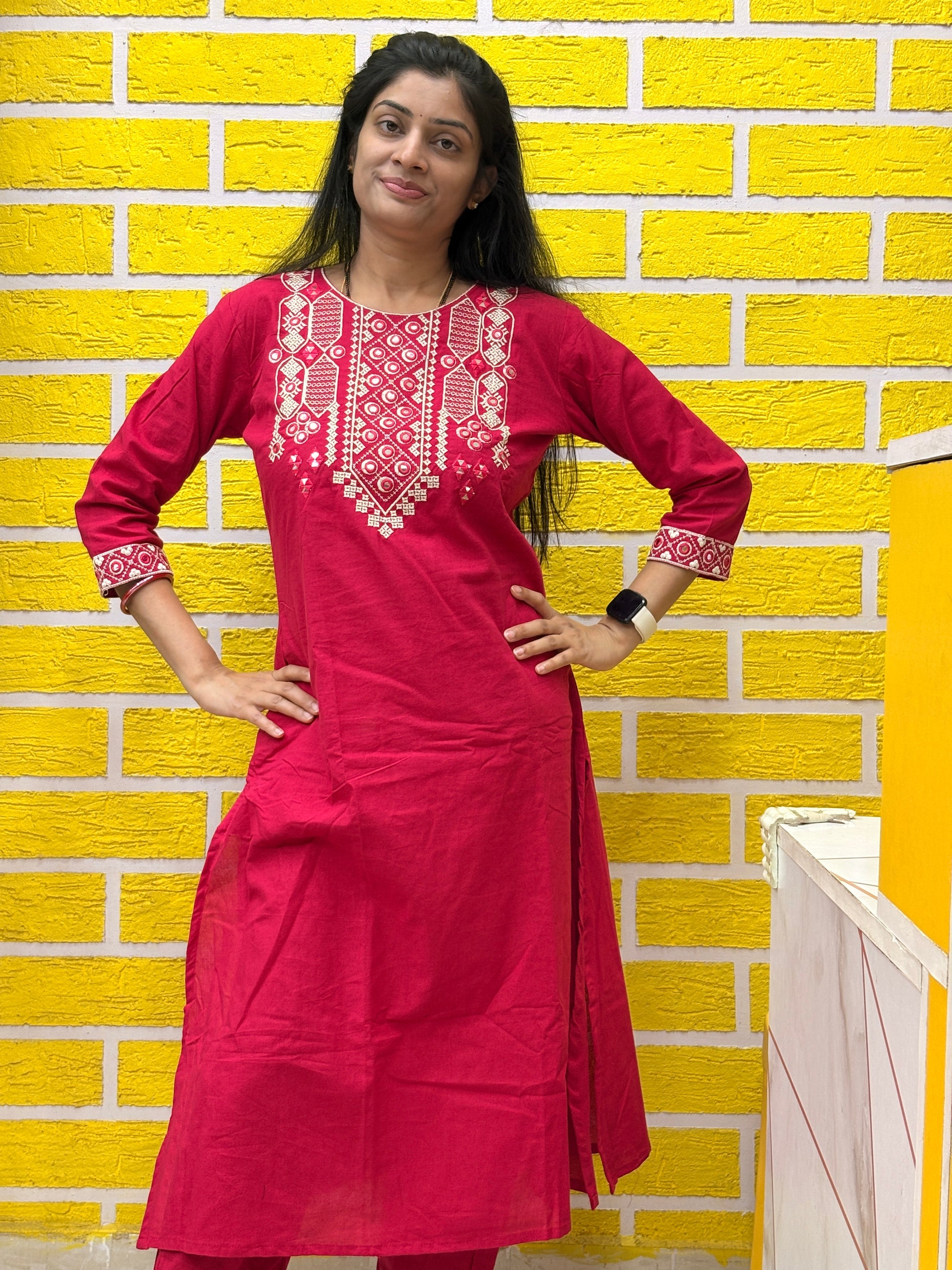 Elevate your everyday ethnic style with this elegant red embroidered cotton coord set. Featuring intricate white ethnic embroidery on the yoke and sleeve cuffs, this outfit brings together traditional charm and modern comfort. Designed in a straight silhouette with side slits, the kurti is paired with perfectly coordinated straight-fit pants, making it a versatile 2-piece coord set for office wear, casual outings, and festive daywear.